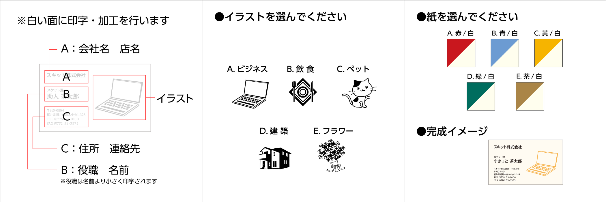 A:会社名・店名 B:役職・名前 C:住所・連絡先